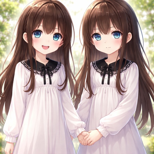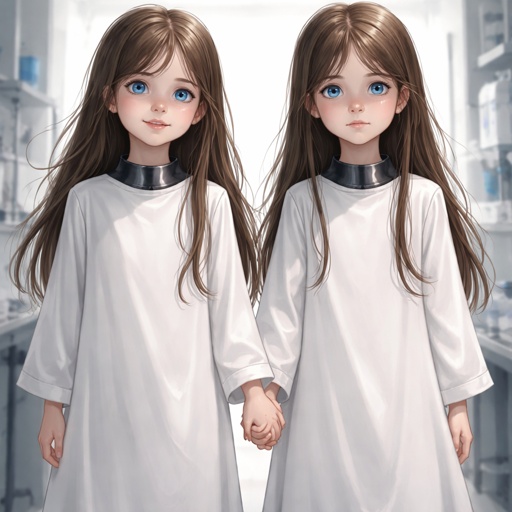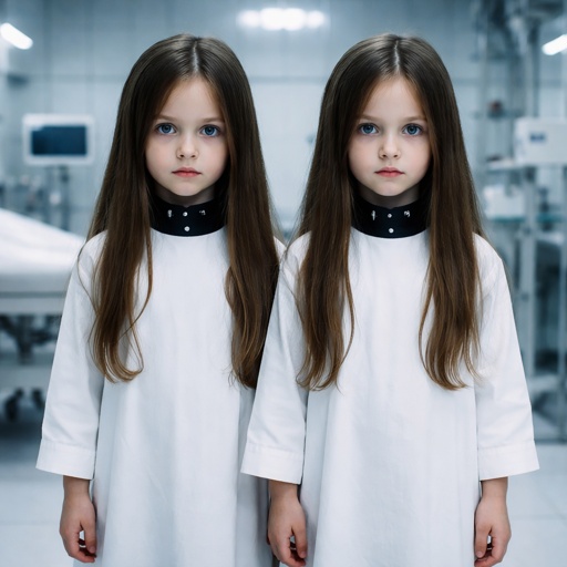 Two twin sister around seven years old with long brown hair and blue eyes they are experiment subjects with a long white...