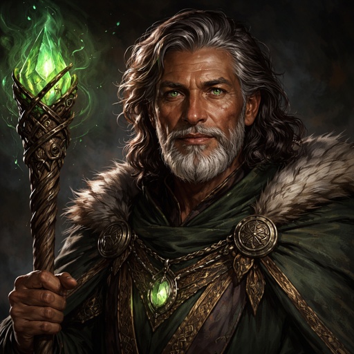 Male human wizard green eyes medium size hair brown skin white 762 years old
