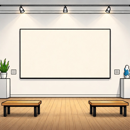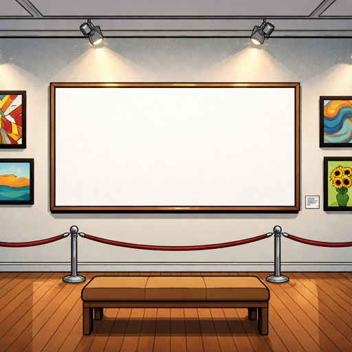 No caricature realistic, no speech bubbles an art gallery wall with a large blank, horizontal painting no people
