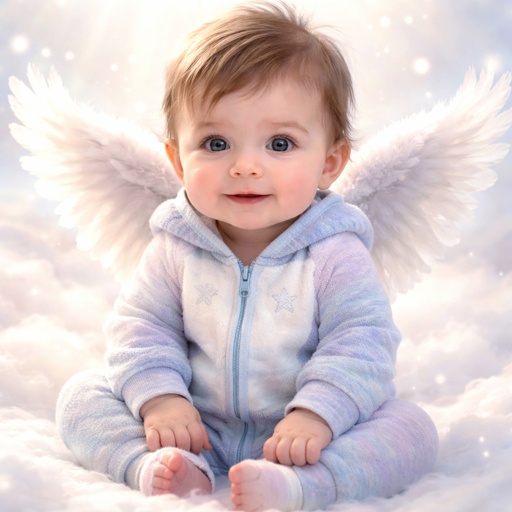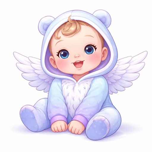 Baby in with wings in a blue white and purple onesie