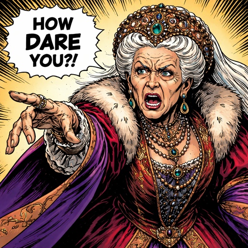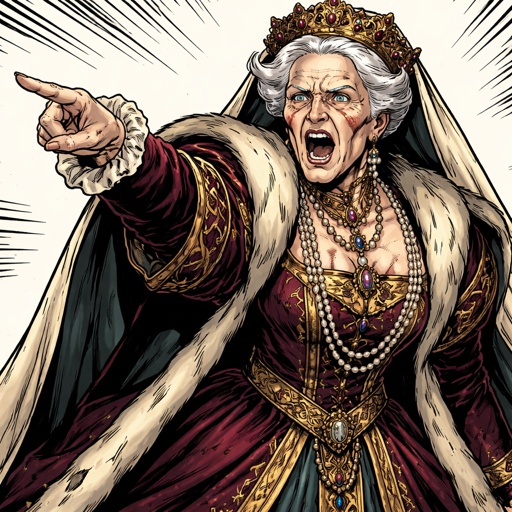 very elderly woman dressed in expensive renaissance robes her arm is extended and he is speaking. she is angry. She is s...