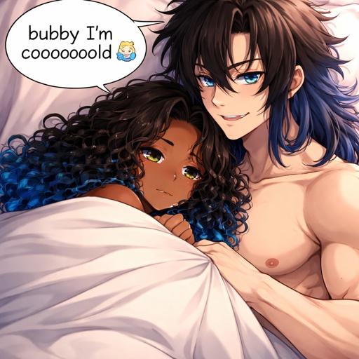 A dark skin woman with black curly hair with fade blue tips is in the bed kissing grown Inosuke