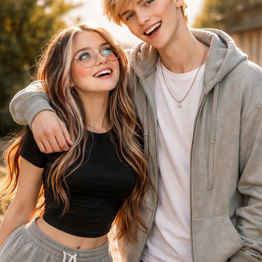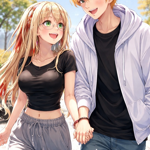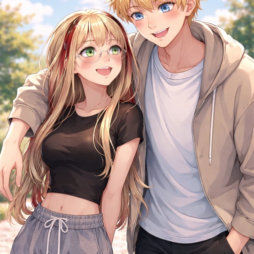 A girl with long blonde hair with white and red highlights a clear glasses frame and green eyes she is wearing baggy swe...