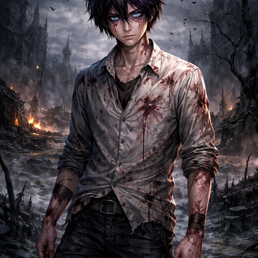 An 18 year old boy who has black hair with purple stripes and blue eyes. He is wearing a dirty white shirts and black pa...