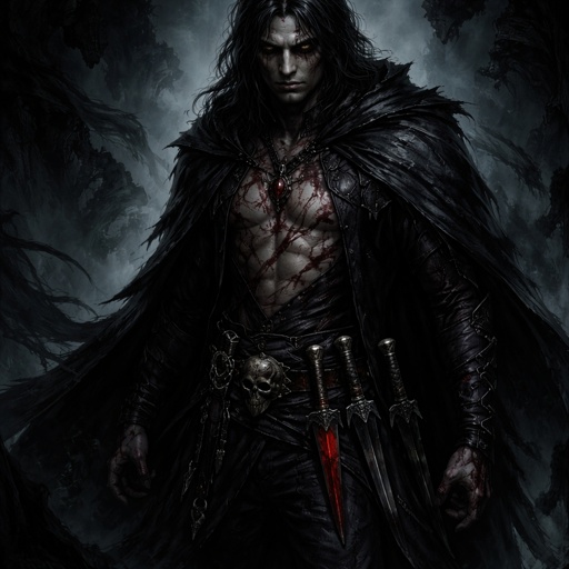 Necromancer Reb the bloody cut scars all over his body long black hair black cloak black pants three daggers on his belt...