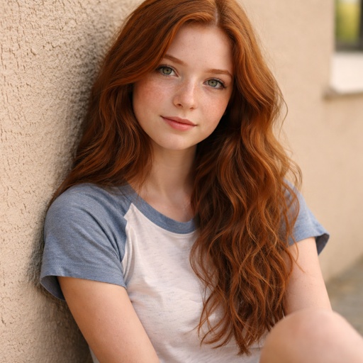 High school girl sitting against a wall with wavy red hair