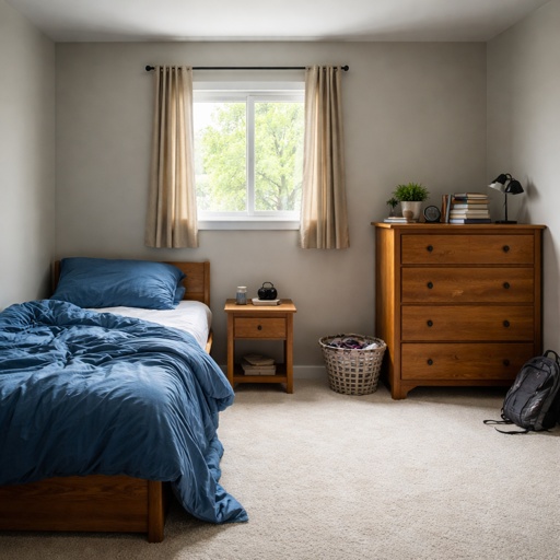A room that has a twin sized bed in the left corner of the room. The bed has sheets are blue and the bed is messy. There...