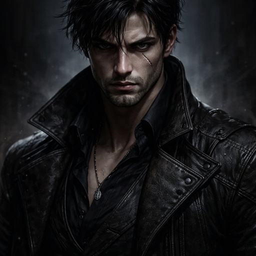 Realistic, refined likestrange priest we see him in three-quarter view from the left. The background is black. There ar...