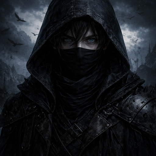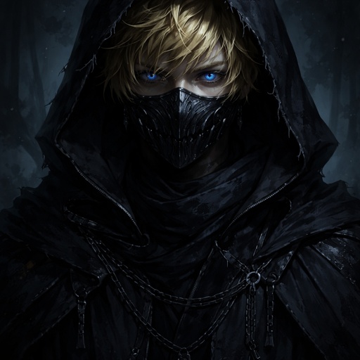 A 17 year old boy who has gold hair and has blue eyes. He is wearing all black. There is a mask that covers his mouth an...