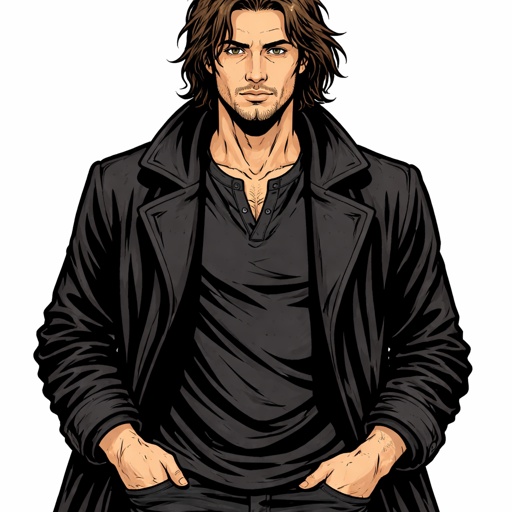 Realistic refined a man late 20s long brown hair he wears a dark robe with no hood. No superhero stuff no magic stuff ju...