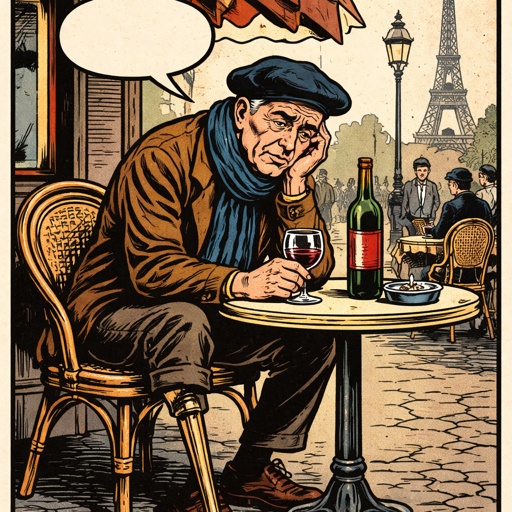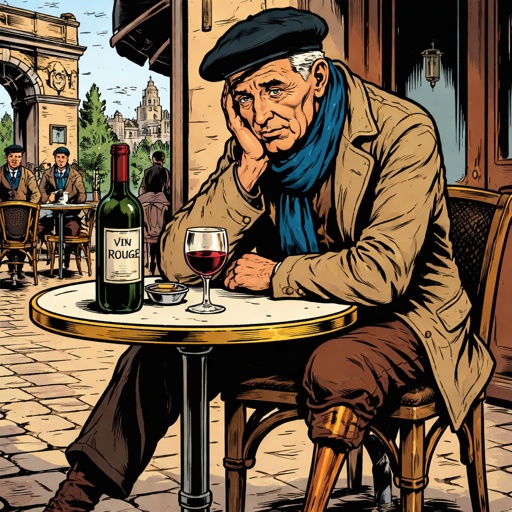 An old French man with a beret and a peg leg sits at a table in a café with a bottle of wine and a glass. He is very dep...