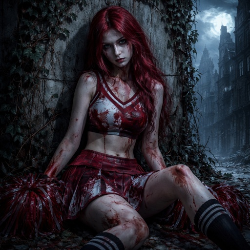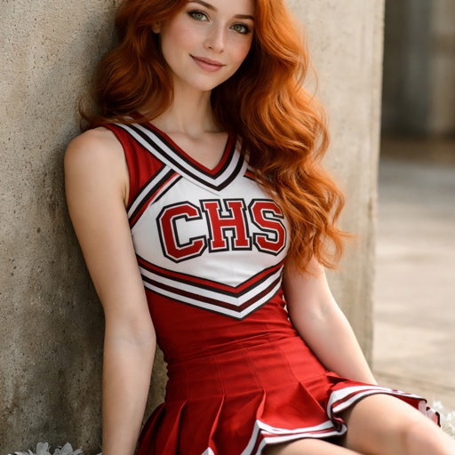 High school girl with wavy red hair sitting against a wall and wearing a cheerleader uniform