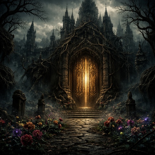 A big castle that has trees around the big golden doors that lead inside. Next to the doors is a garden of different col...