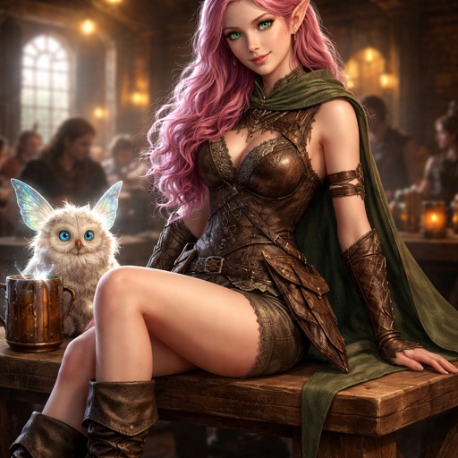 D&D image. Hyper realistic, female Eladrin, wayfarer outfit, leather shorts, sleeveless armor. Boots at ankles. High dex...