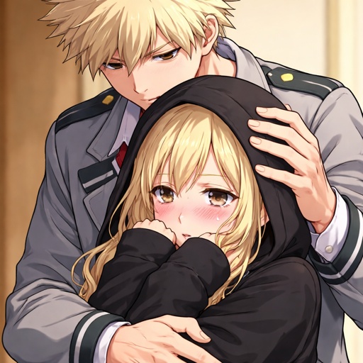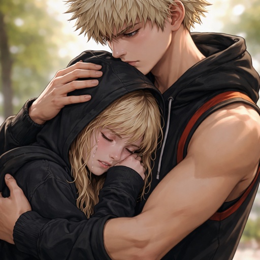 Bakugo hugging a teenage blonde girl sobbing into his shoulder with a black hoodie and the hood on her head