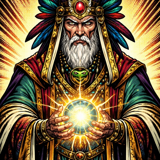 A shaman in Renaissance robes with a headdress wearing a snake symbol around his neck and holding a shining ball. Realis...