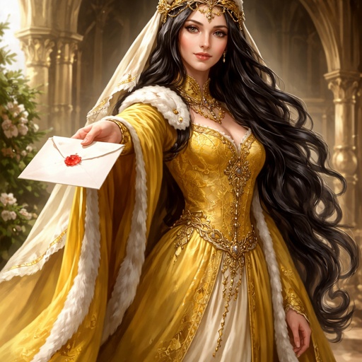 A tall princess in a yellow robe with a golden hair dress she has a long, long black hair she holds a letter outward in ...