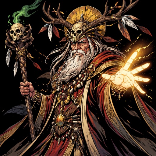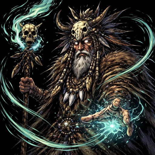 Realistic, refined . A mystic shaman see him in three-quarter view from the left. The background is black. There are no ...