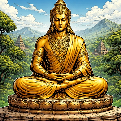 Long shot .A gold statue of an indigenous, Indian style character in a robe in a Buddhist meditation position