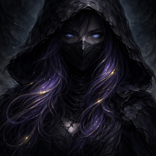 A 17 year old girl who has purple hair with gold stripes and has blue eyes. She is wearing all black. There is a mask th...