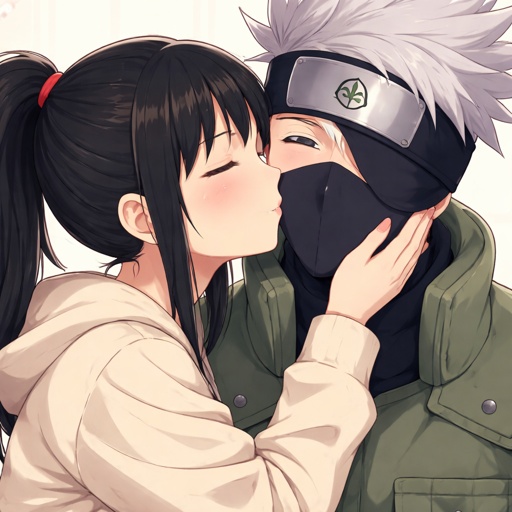 Adult girl with a dark ponytail kissing kakashi