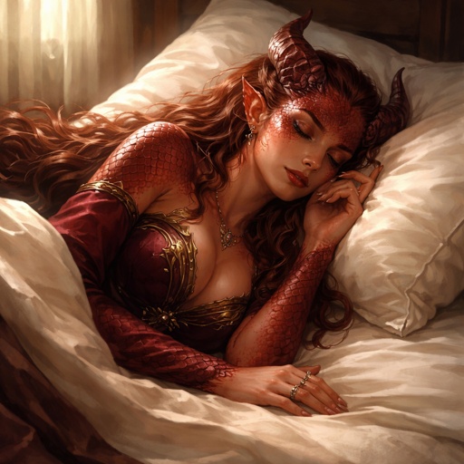 a deceptive dnd red dragonborn sorcerer lady sleeping in her lovers bed