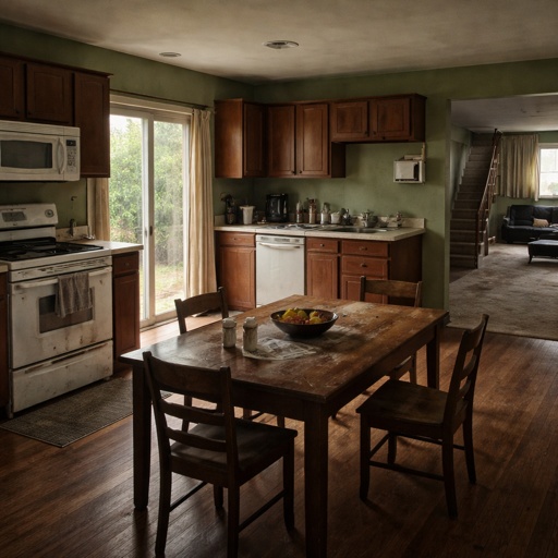 A kitchen that has green walls and brown cabinets. The oven and microwave are white and look run down. At the center of ...