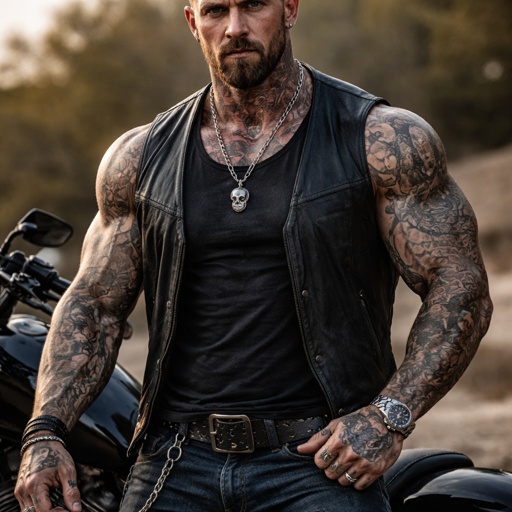 7 foot tall biker tattoos all over his arms and neck muscles a small beard a small amount of hair and some rings on his ...