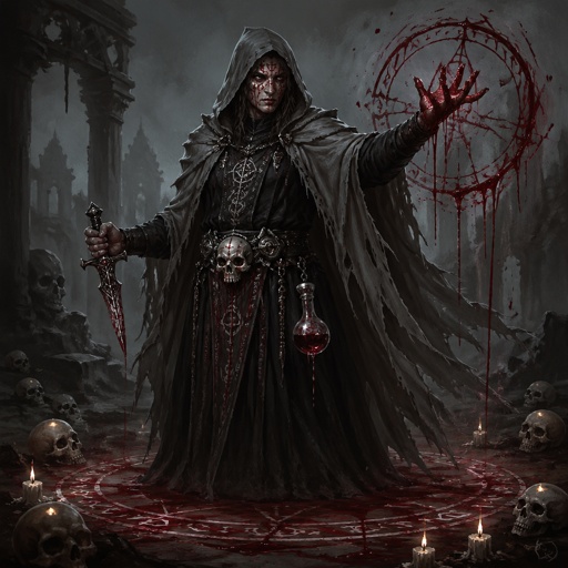 Czarodziej o białej skórze i z wyrytymi magia runami na twarzy. Ubrany jest w czerwoną szatę z srebrnym pasem do którego...