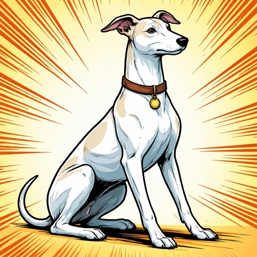 An elegant white Whippet dog, seated. Mouth closed. three-quarter view