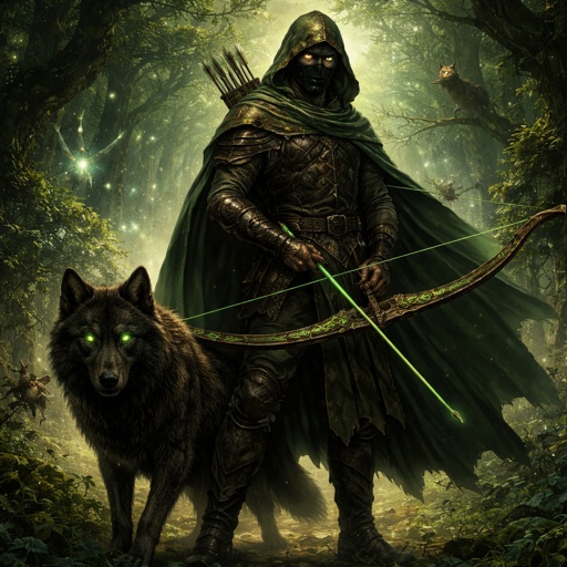 Create a rogue DnD inspired character in forest green cloak and wearing forest green mask over his mouth! Have him wear...