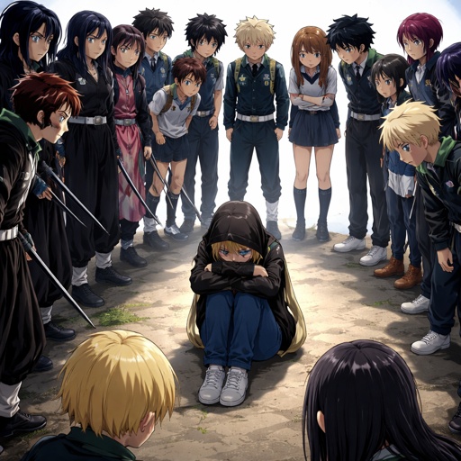 The demon slayers, and class one a comfoting a teenage blonde girl wearing a black hoodie with the hood on her head and ...