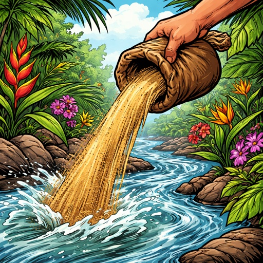 A hand holding a bag of sand pour it on the waters of a stream surrounded by plants and flowers. The scene is indigenous...