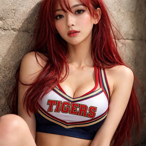 Asian girl with red hair sitting against a wall and wearing a cheerleader uniform sports bra