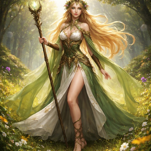 A full body shot of a beautiful half elf with blonde hair. Bright green eyes. She is posing in a meadow. She is clad in ...