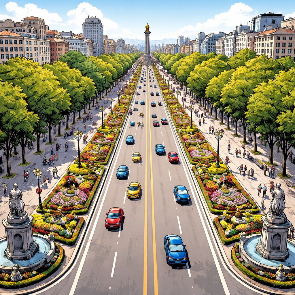 An angle shot, non-symmetrical Realistic, refined, no caricature along Boulevard lined by trees and statues, flowers, an...