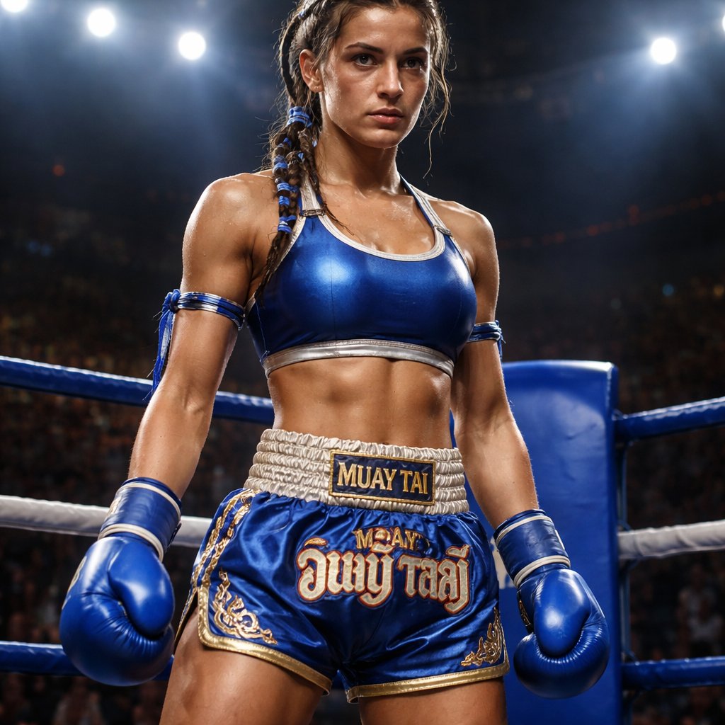 An adult woman in Muay Thai attire stepping into the ring for a big fight