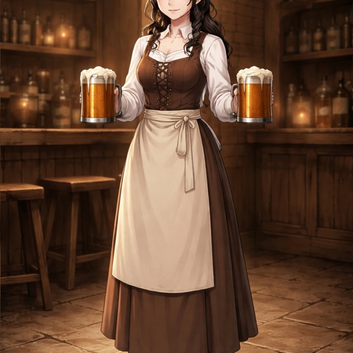 Human female tavern server, adult (early 30s), dark hair, silver eyes, professional and composed, wearing modest practic...