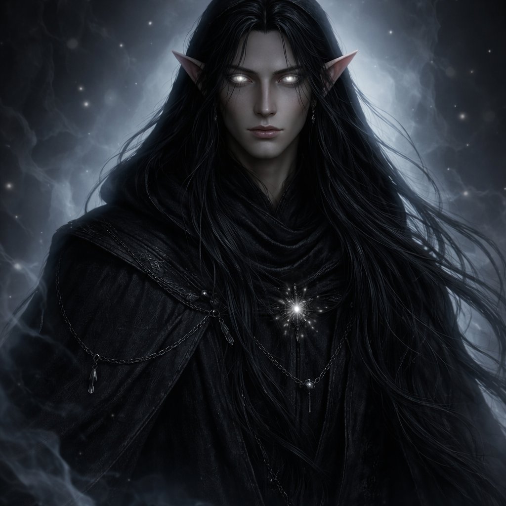 Tall dark pale male elf with a long dark cloak and braided black hair and white eyes