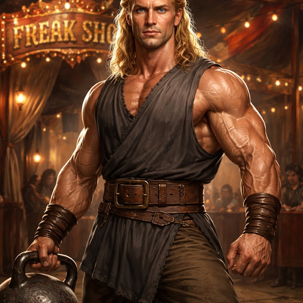 A tall well~proportioned male, so handsome he looks like a Greek god with muscles. With deep-set blue eyes and strong brows, hinting at inner depth“. His hairstyle is a blonde mullet. He works at freak show as a strong man. His outfit consistsed of a Charcoal-toned sleeveless Greek tunic, thick leather belt, leather wristbands/cuffs, brown pants.