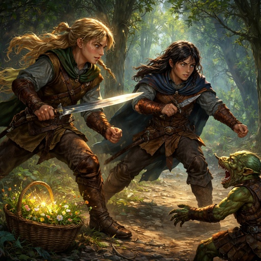 Two young male squires, in medieval garb, fighting a goblin in the woods, one boy has tan skin and very long blond hair ...