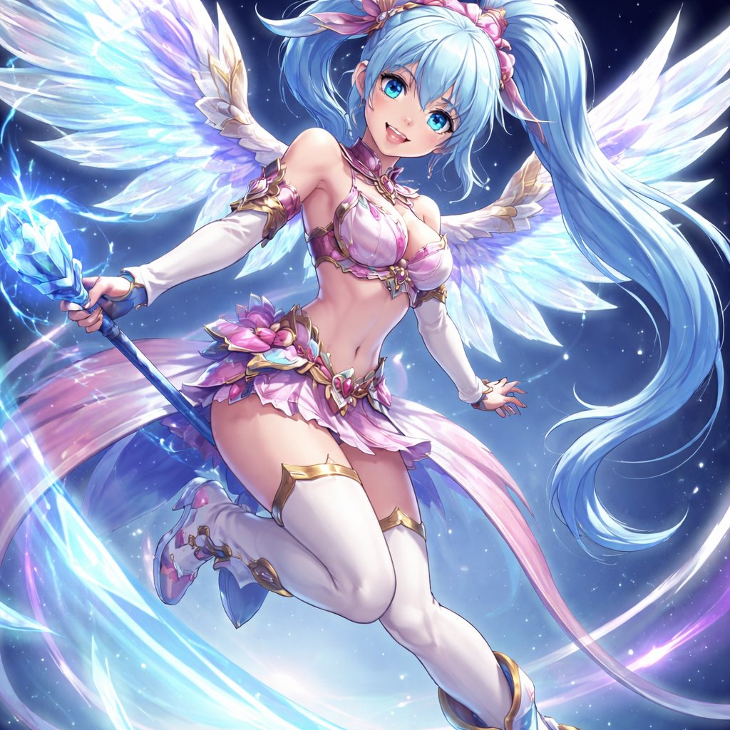 Full view Winged naga with long white hair and bright blue eyes her tail is light purple