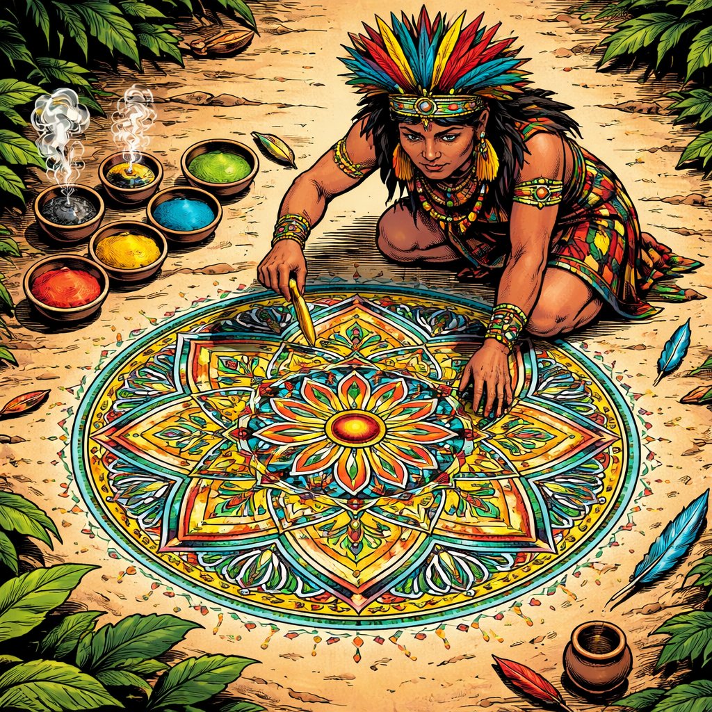 drone view of someone in in South America, indigenous clothing, creating a sand mandala
