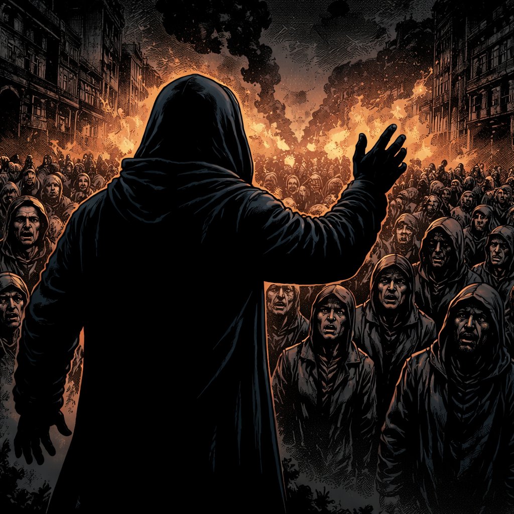 Silhouette of a man in a hood speaking before a crowd of impoverished people. These are really the poor people. The scene is dark and menacing realistic.