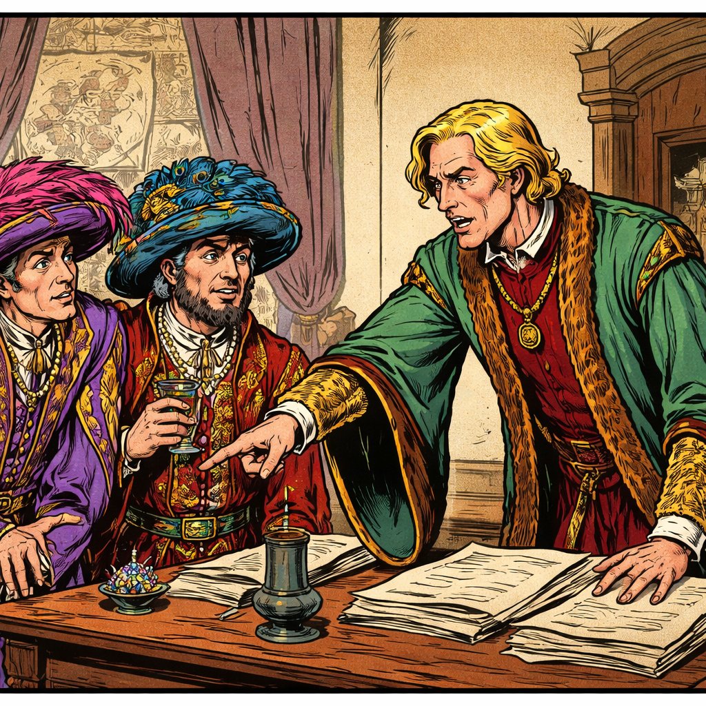 Realistic refined no caracature no speech bubble. A slim blonde man in renaissance robes is severely lecturing several ambassadors dressed in flamboyant costumes. Old style Office setting