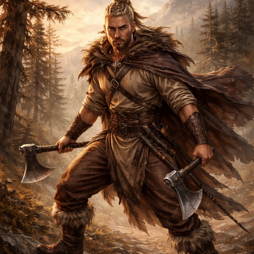 Young male short blond braided top knot/man bun wearing a tunic/norse shirt with authentic cut leg lacing pants, leather Demi-boots and faux fur shoes, with a Viking rune tattoo on forearm holding axes in both hands