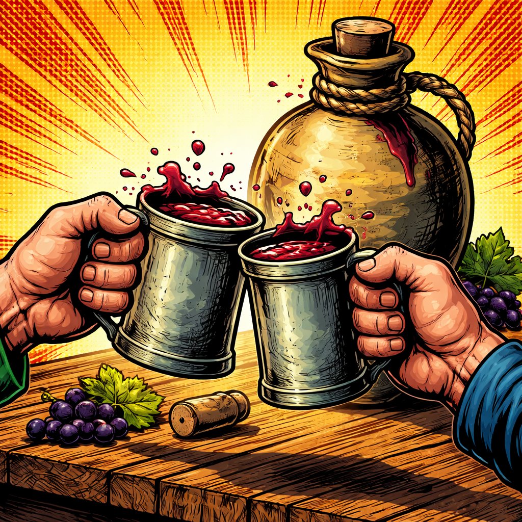 An old jug containing wine. There are two old mugs only we see our hands wrapped around the mugs and the jug of old wine...