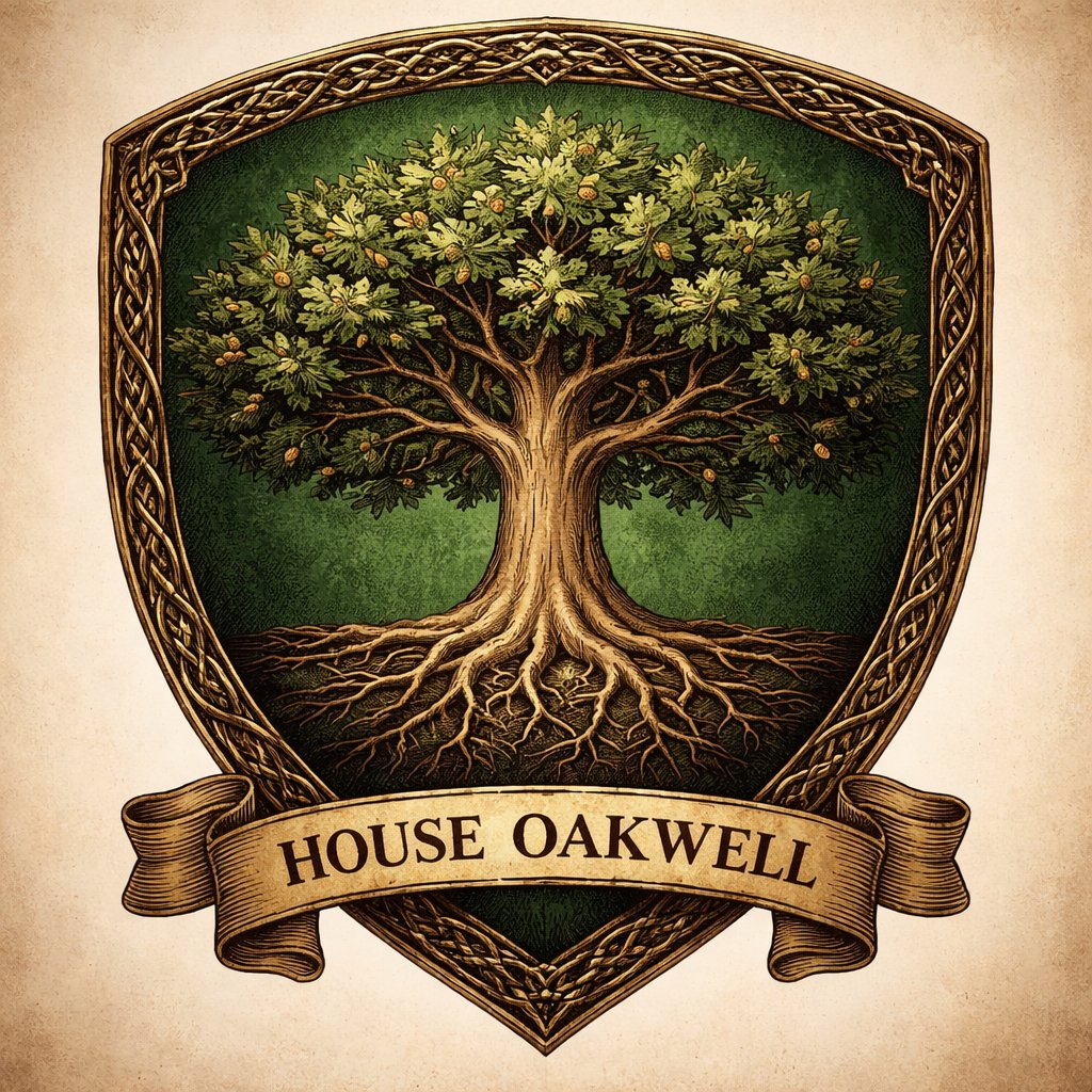 Sigil Name: The Rooted Crown The sigil of House Oakwell is a symbol of endurance, legacy, and quiet strength—like the ancient forests they claim as their domain. At its center stands a great oak tree, its trunk thick and unyielding, with deep, sprawling roots that stretch visibly across the base of the shield. These roots are not hidden—they are a mark of pride, symbolizing that House Oakwell draws its strength from ancestry and unbroken lineage. The branches rise wide and full, forming a natural crown-like canopy at the top. Each branch bears clusters of dark green leaves and golden acorns, representing prosperity earned through patience and time rather than conquest. The color scheme is rich and grounded: • Deep forest green field (background): loyalty to land and nature • Burnished gold oak and acorns: wealth, honor, and noble endurance • Earth-brown roots and trunk: resilience, stability, and ancient heritage Along the border of the shield, a subtle ring of interwoven vines encircles the sigil, symbolizing unity within the house and the bonds that tie its members together. House Words (optional): “From Deep Roots, We Rise.” Overall, the Oakwell sigil does not boast of war or conquest—it speaks instead of something older and harder to break: patience, survival, and strength that cannot be uprooted.