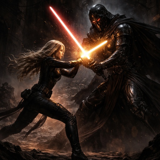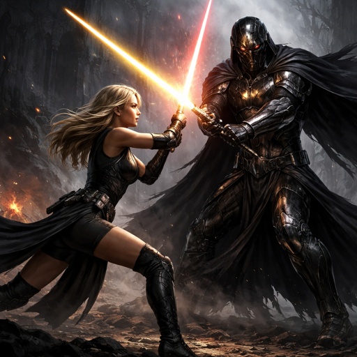 A full body picture of a female blonde Jedi in a black combat outfit holding a yellow lightsaber dueling a tall black si...