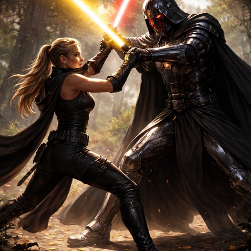 A full body picture of a female blonde tan Jedi in a black combat outfit holding a yellow lightsaber dueling a tall blac...